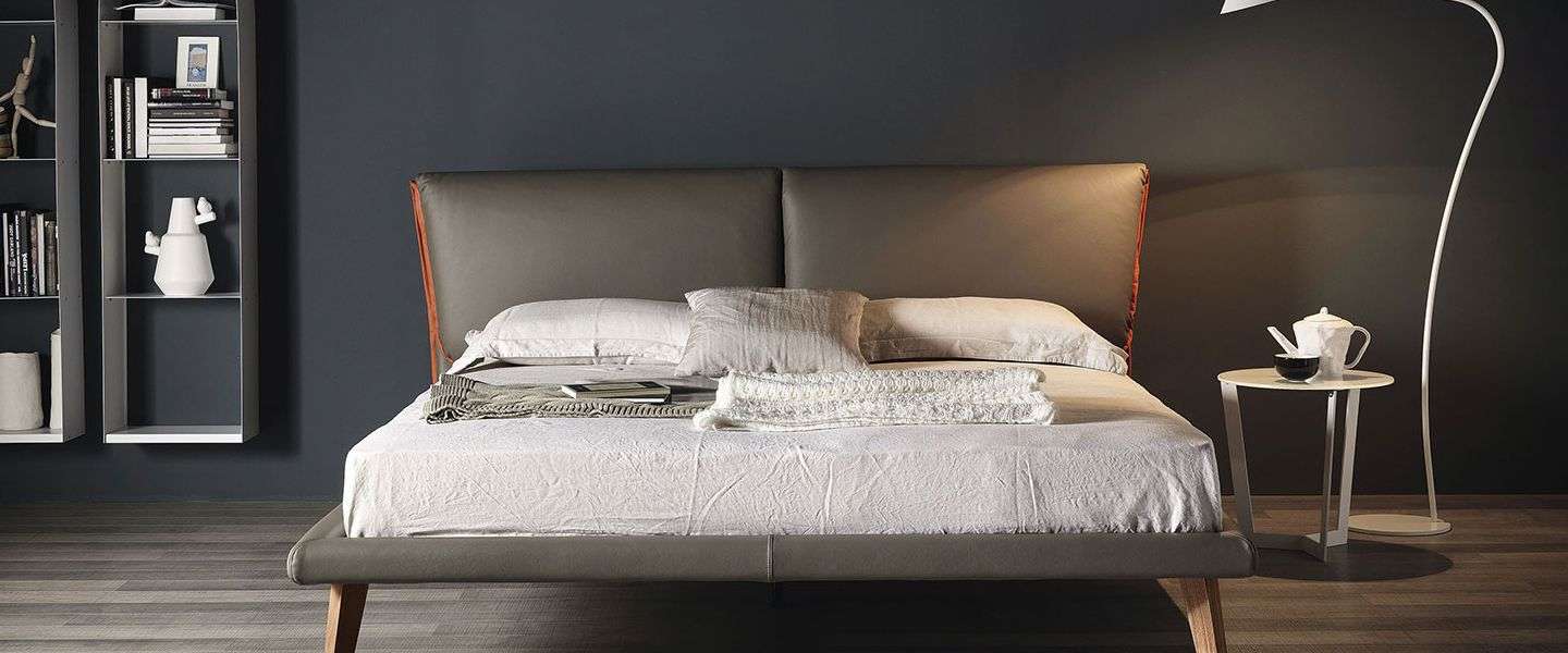 Cattelan Italia letto Adam, design Gino Carollo. Adam è un letto dalle linee morbide ed eleganti che può essere rivestito in tessuto, ecopelle e pelle, mentre i piedini possono essere in noce canaletto o in rovere bruciato.